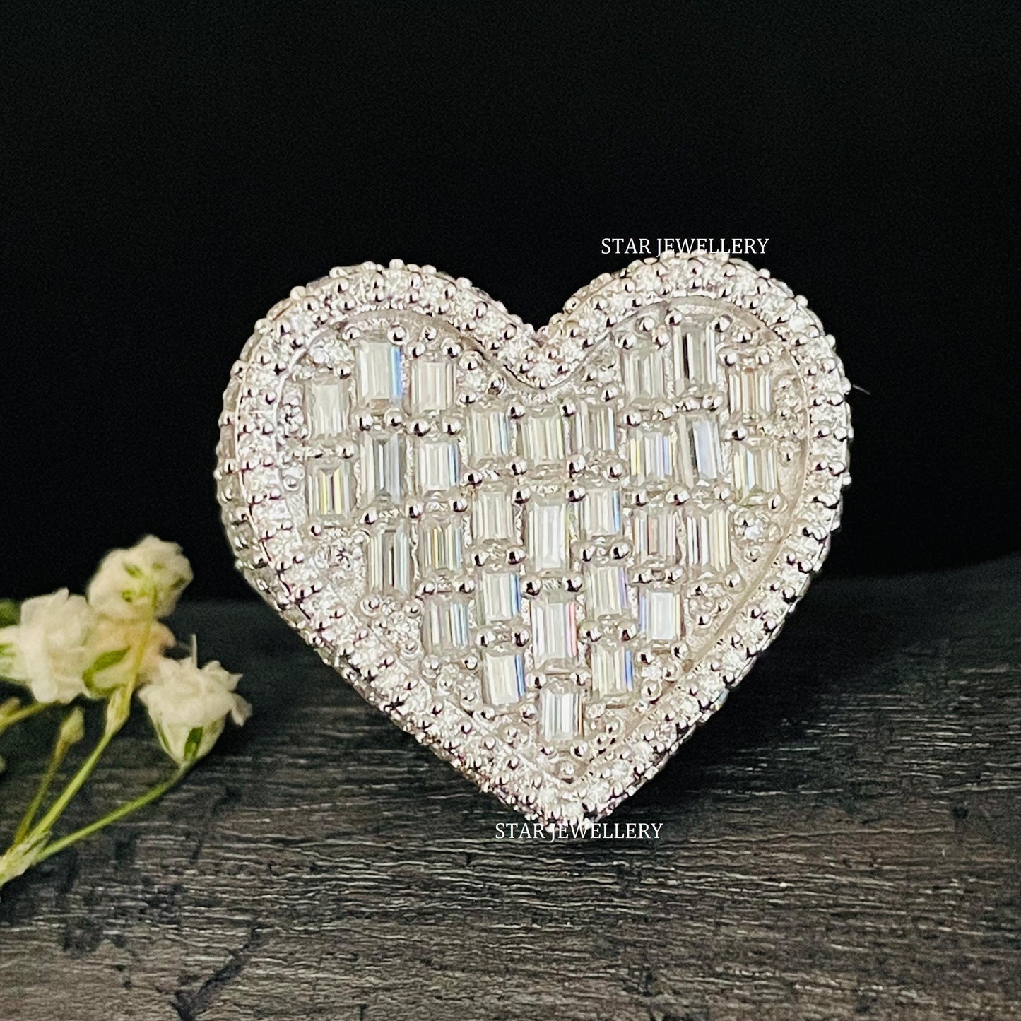 Unisex VVS Baguette Moissanite Heart Ring for her, VVS Moissanite Iced out Heart Ring with 925 Sterling Silver, Baguette Heart Ring for him